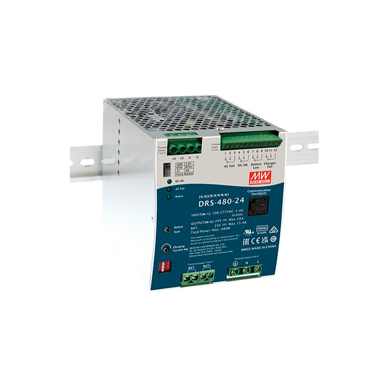 DRS-480 — это серия источников питания мощностью 480 Вт AC/DC типа DIN-рейка для систем безопасности. Помимо основного выхода, в ней есть дополнительная схема зарядки аккумуляторов, которая автоматически регулирует ток зарядки в зависимости от нагрузки на основной выход. DRS-480 принимает универсальный входной диапазон от 90 до 305 В AC и поддерживает номинальные выходы 24 В DC, 36 В DC и 48 В DC для различных систем.